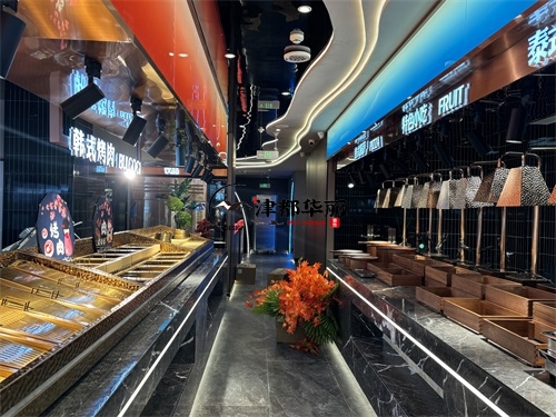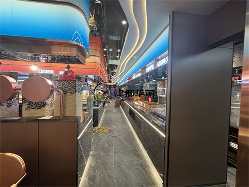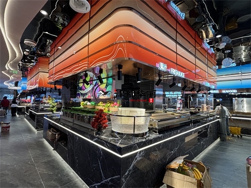 今天分享的是青铜峡回香渔自助餐厅装修设计实景,这家自助餐厅装修设计将“潮流科技感”与“轻奢休闲风”两种风格巧妙融合在一起,既贴合当下年轻消费群体的审美偏好,又通过空间层次的营造兼顾了自助餐饮的功能需求,是近年餐饮空间设计的典型流行范式。前厅的顶面与墙面采用波浪形的曲面造型,搭配橙红、宝蓝等高饱和度渐变色彩,叠加内嵌式线性灯带的勾勒,既打破了传统餐厅的规整感,又通过科技感的光影营造出“赛博休闲”的氛围——这种手法既借鉴了网红餐饮的“打卡属性”设计,又通过色彩分区(如橙红对应热菜区、宝蓝对应海鲜区)实现了功能引导,让顾客能快速识别餐区类型。